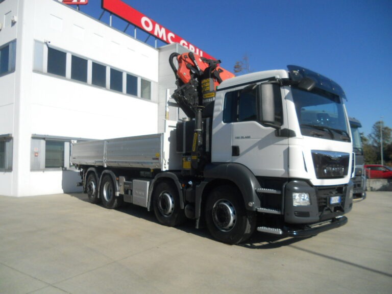 MAN TGS 32.480 CON GRU PALFINGER PK34002-SH D + PJ080B E CASSONE RIB.LE TRILATERALE SPECIFICHE TECNICHE